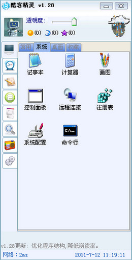 酷客精靈是一款高性能系統輔助軟件,它運行速度快,消耗內存不超過3M,界面美觀,結構簡潔,可像QQ,MSN等軟件