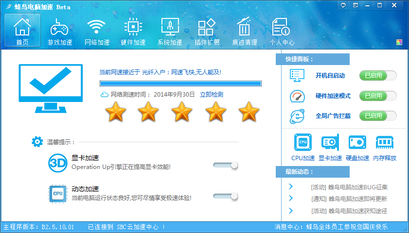 蜂鳥電腦加速:強大的電腦加速軟件,一鍵游戲加速、網絡加速、硬件加速、系統加速,讓電腦響應變得更迅速、