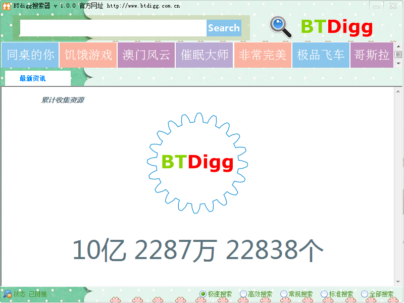 btdigg中文名為btdigg搜索器,是一款小巧的互聯網資源搜索工具,基于先進的P2P搜索技術,可在瞬間搜索全球b