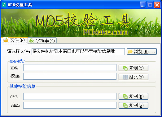 MD5校驗工具可以校驗文件和字符串的MD5值。另外還支持校驗文件的CRC和SHA1值,另外還支持文件拖動到窗口顯