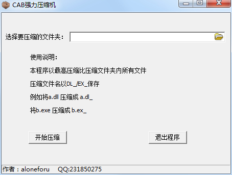 CAB強力壓縮工具。本程序以最高壓縮比壓縮文件夾內所有文件,壓縮文件名以DL_/EX_保存。例如將a.dll 壓縮成