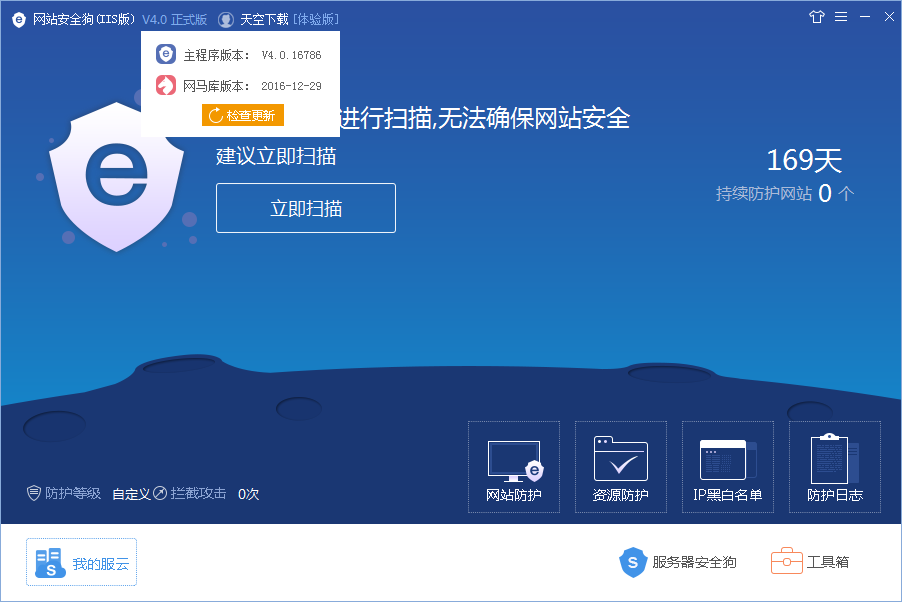 網站安全狗功能介紹: 1、攔截各類注入、跨站、漏洞、應用風險 攔截SQL注入、XSS跨站、struts2漏洞、建站程