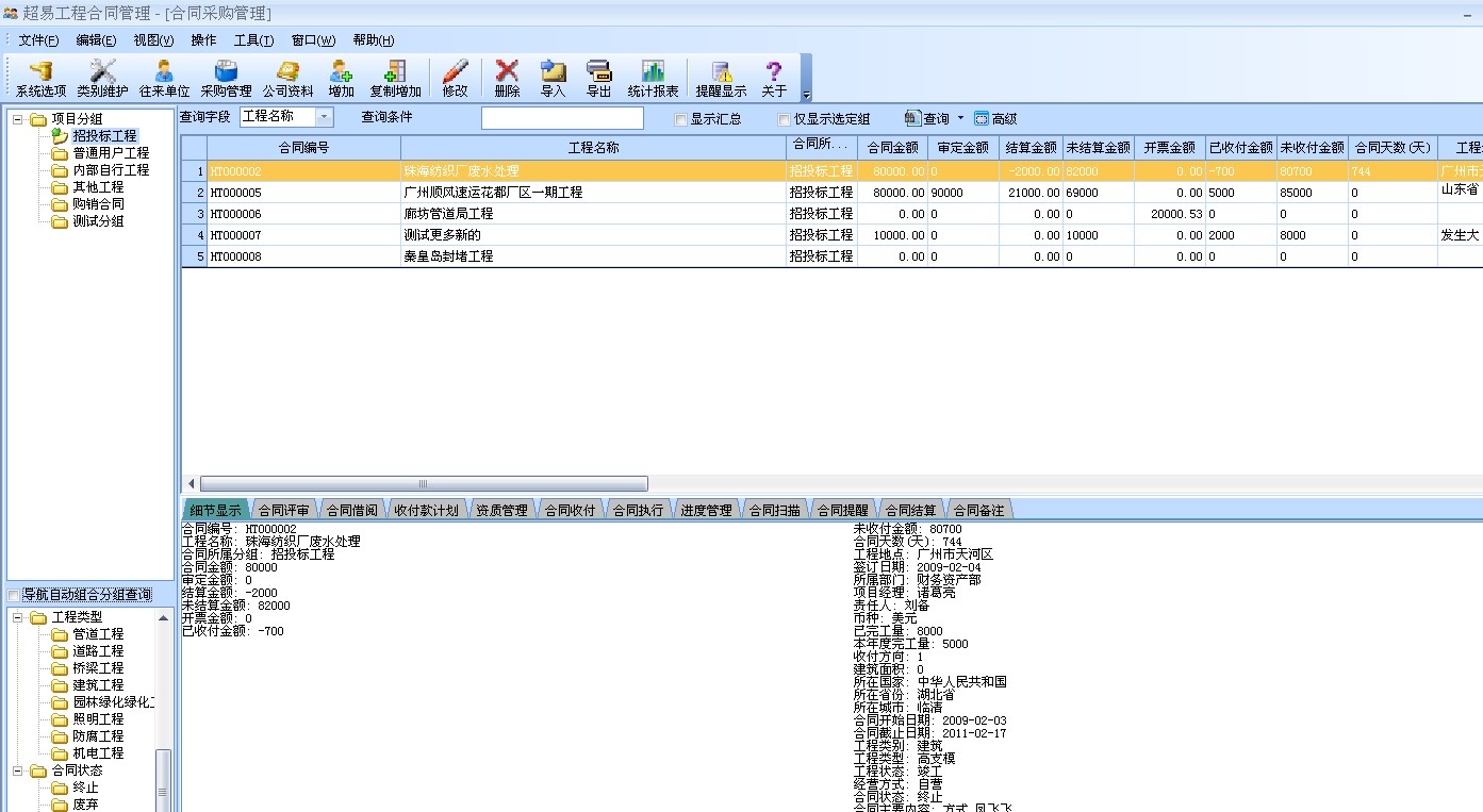 易工程合同管理軟件的基本功能介紹: 基礎(chǔ)資料: 合同類型分組管理:可以隨意設(shè)置合同類型分組級別,可以按