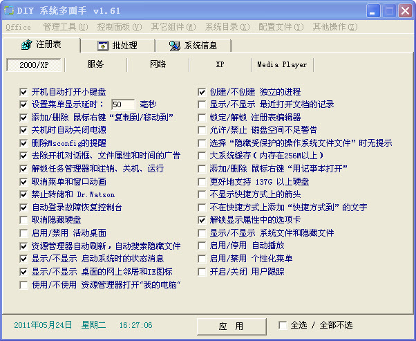 1.注冊表的優(yōu)化,包括對服務(wù)、網(wǎng)絡(luò)、Windows Media Player等的優(yōu)化,雖然功能不多,但都是從節(jié)約系統(tǒng)資源的角度出發(fā)的,那些華而不實(shí)的技巧該軟件絕對沒有;