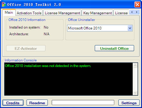 Office 2010 Toolkit是一個一鍵激活MS Office 2010的工具。原理就是利用KMS來激活,不是新的激活技術:( 180天后必須手工再次激活一次。網上流傳的MAK密鑰激活甚稱完美,但有次數限制,激活后要備份激活信息,以便重裝系統恢復激活。Office 2010 Toolkit也有備份激活信息功能,建議下載一個Office 2010 Toolkit備用。