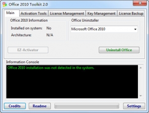 Office 2010 Toolkit是一個簡單的好用的MS Office2010激活工具。office2010密鑰生成器原理就是利用KMS來激活,不是新的激活技術:( 180天后必須手工再次激活一次。網上流傳的MAK密鑰激活甚稱完美,但有次數限制,激活后要備份激活信息,以便重裝系統恢復激活。Office2010 Toolkit也有備份激活信息功能,建議下載一個Office 2010 Toolkit備用。