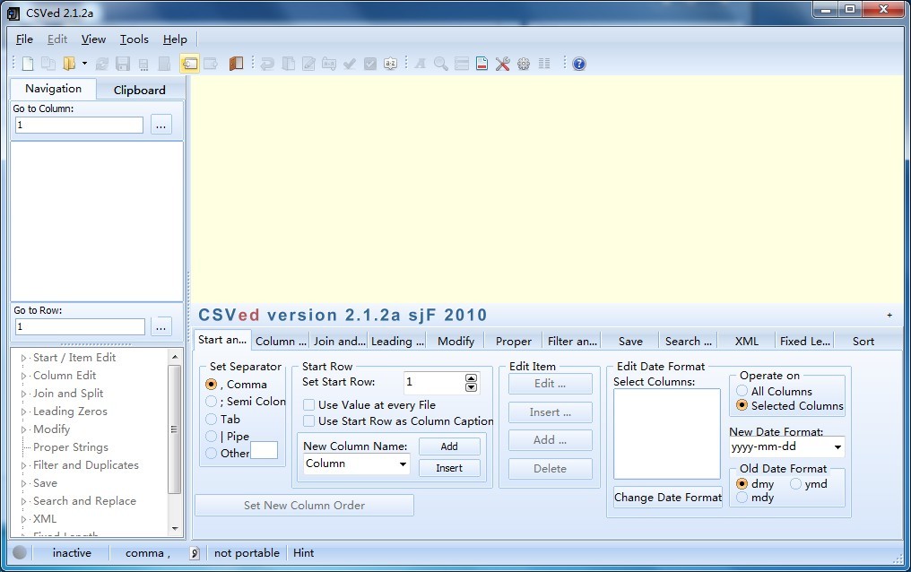 CSVed允許你分別使用任何分離器操作CSV 文件。CSV文件的內容在一個列表瀏覽窗口當中是可見的,允許你簡單地進行編輯、插入、添加、刪除和移動項目操作,就像它們位于一個數據庫表格當中一樣。你可以刪除行、添加列或者重新排列列的次序。此外,你可以刪除副本和修復文件或者使用內置的搜索功能尋找指定的記錄。CSVed 還提供了搜索和替換、導出到 XML 等功能。如果你頻繁地使用CSV文件進行工作,該軟件就是一款極其方便的工具。