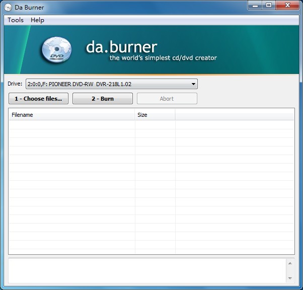 da Burner是一款綠色免費的CD/DVD刻錄軟件,僅一個1MB大小的可執行文件,無須安裝即可使用,也可以放在U盤上運行。daBurner使用非常簡便,刻錄DVD只需兩步:選擇文件、刻錄。
