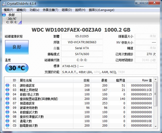 硬盤(pán)里的數(shù)據(jù)至關(guān)重要,因此時(shí)常檢查硬盤(pán)健康狀況是有必要的。CrystalDiskInfo硬盤(pán)檢測(cè)工具通過(guò)讀取S.M.A.R.T了解硬盤(pán)健康狀況。打開(kāi)它,您就可以迅速讀到本機(jī)硬盤(pán)的詳細(xì)信息,包括接口、轉(zhuǎn)速、溫度、使用時(shí)間等。CrystalDiskInfo還會(huì)根據(jù)S.M.A.R.T的評(píng)分做出評(píng)估,當(dāng)硬盤(pán)快要損壞時(shí)還會(huì)發(fā)出警報(bào),支持簡(jiǎn)體中文,推薦一試。