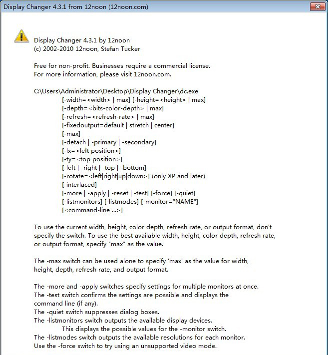 Display Changer是一個顯示分辨率修改工具,必須利用命令參數來調用它,非常方便其他程序靜默調用。直接運行程序有幫助提示,可以通過參數來修改指定的分辨率長、寬和刷新率等。