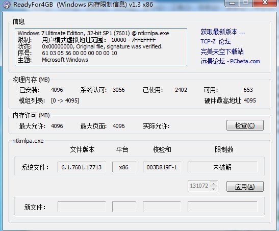 win7 4G內存補丁(readyfor 4gb)1.3 綠色版|
